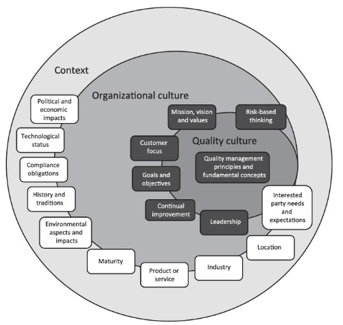 Imagen tomada de la ISO 10010:2022: Principios, conceptos fundamentales y cuestiones internas y externas que contribuyen a la cultura de calidad.